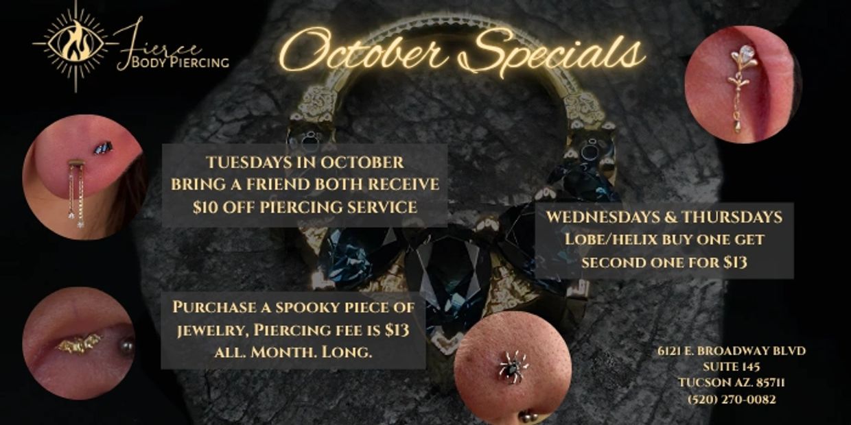 Every Tuesday this month, bring in a friend to get pierced with you, and you both receive $10 off your services.